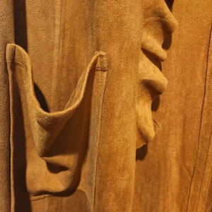 Chic and versatile Moon River faux suede longline vest in a rich camel brown. Features a soft draped open front, ruffle trim detail, oversized front pockets, and a relaxed boho silhouette. Perfect for layering over dresses, sweaters, or jeans for an effortlessly polished fall look.