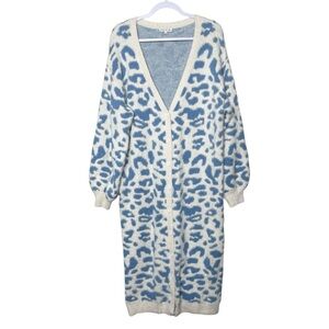 Moon River Fuzzy Knit Leopard Print Button Cardigan Sweater Blue White Small