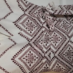 Moon River S White and Burgundy Patterned Romper. Tee sleeves with shorts bottom that looks like a skirt on the front. It has a deep v neck, tie waist, zip up back, and studs around the bottom. Super cute fit!