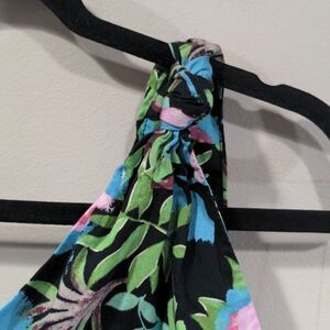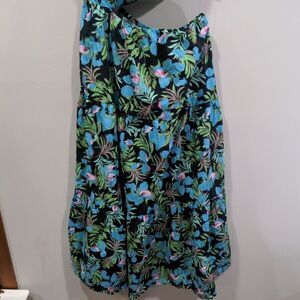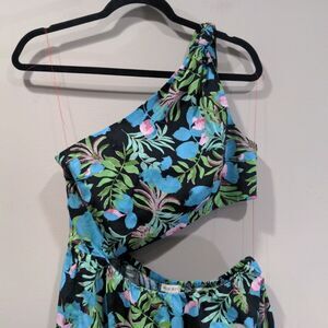 Features: one shoulder with knot and peek-a-boo cut out, elastic waistband skirt with zipper closure, tiered style skirt; lightweight skirt and lined top; perfect vacation/beach style