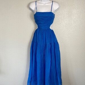 Chic midi dress with a ruched bodice. Features a striking blue hue. Perfect for stylish outings. Size XS. NWT. Ties in back so pit to pit adjustable to size. Back skirt has elastic stretch.