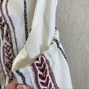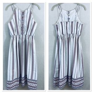 A Moon River midi dress in an abstract print. Lace-up ties cinch the bodice, and smocked elastic gathers the waist. Spaghetti straps. Lined.