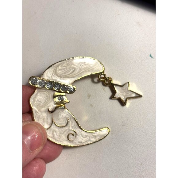 Moon Shaped Gold & White Brooch With Star Charm & Rhinestone Accent