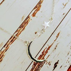Cute Moon & Star pendent in silver tone over alloy metal. The star is stationary, but the moon is not. 2 inch extension chain gives length from 18-20 inch. Large lobster claw clasp.
