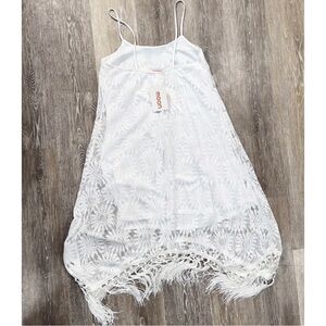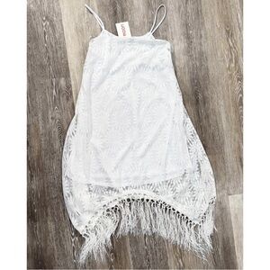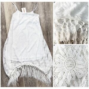Moon Sz S White Floral Lace Asymmetrical Fringed Slip Dress Cover Up NWT NEW
