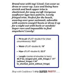 Brand new with tag! Lined. Can wear as dress or cover-up. Lace and lining have stretch and back upper trim is elasticized, for easy on/off. Gorgeous sunflower type lace pattern. Lovely fringed trim. Perfect for the beach, wearing over your swimsuit, adorable with western cowgirl boots or dress it up for a night out with heels or sandals! Super rare and impossible to find anywhere! Lovely!