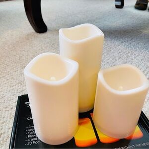 Frameless, waterproof pillar candles, trio. Operates by remote that has a timer, color selection. Light flickers making it look, feel like real candles.