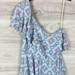 Pretty pastel hues heighten the boho-chic vibe of a breezy one-shoulder dress featuring a ruffled neckline and a tie at the waist.