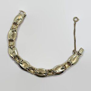 Take a step back in time to the 50s! This is a vintage plastic thermoset moonglow lucite bracelet. It is a beautiful glowing pink shade. This is accented with shining gold tone metal. The thermoset has an oval shape to it. It has a fold over clasp. It even has a safety chain! Very retro, rockabilly, classy chic! How fun!