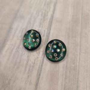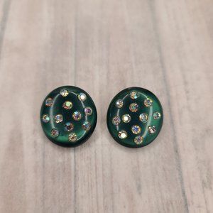 Really pretty and sparkly vintage thermoset AB crystal and green moonglow lucite earrings.