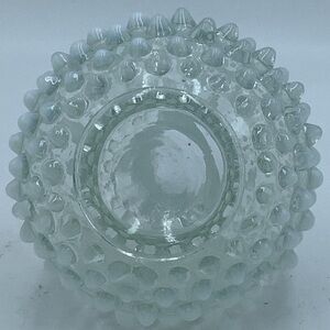 Gorgeous pale blue opalescent hobnail bottle. There are no markings on the bottle but same bottle was found on Internet as a Fenton Moonglow perfume bottle. Could also be used as a vase.