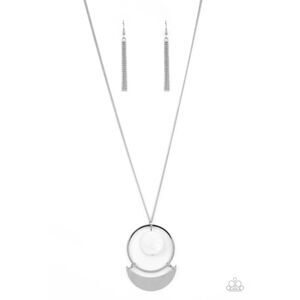 A white shell-like disc swings from the top of a flat silver hoop at the bottom of a lengthened silver chain. A flat silver crescent frame swings from the bottom of the display, creating a sleekly stacked pendant. Features an adjustable clasp closure.
