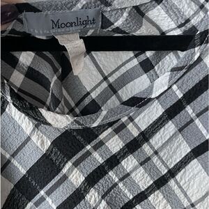 The Moonlight Y&S Fashion Design Drapey Plaid Tunic is a stylish and versatile top for women. This sleeveless tunic features a scoop neckline, making it a flattering and comfortable choice. The black and white plaid pattern adds a touch of sophistication, while the XL size ensures a comfortable fit. Made from a blend of rayon, poly, and spandex, this top is designed with both style and quality in mind. The asymmetrical design and pocket accents add unique elements to this designer piece.