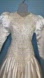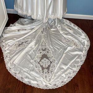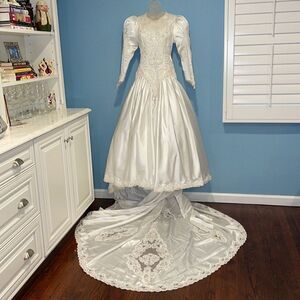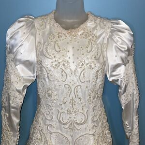 Moonlight Bridal Vintage Beaded Satin Long Sleeve Wedding Gown. Elaborate pearl, beading on the dress's bodice, sleeves, hem of the skirt, and the gown's train. Intricate lace throughout. Classic puffed long sleeves. Tiny buttons up the back of the dress, all attached. Bow on the back. Long train can be bustled under the bow, hook & eye all attached. Satin skirt, wrists & neckline have some marks that need spot cleaning, especially at the bottom hem. All hard to see without close inspection. Dress just needs a professional cleaning. Beading is well in tact. This would be an incredible vintage wedding dress costume for a stage performance or film/movie. Photos are part of the description, zoom on photos for detailed condition. Size-10 Measurements are seen in the photos. I did my best to photograph, but can provide additional photos if necessary. Feel free to ask questions. Next day shipping!!!