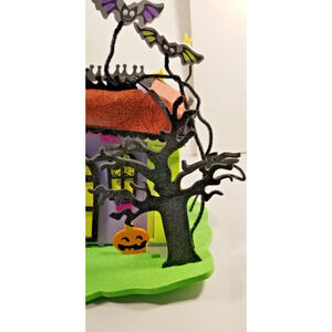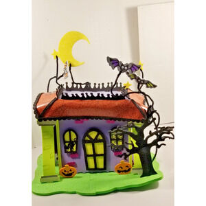 Step into Moonlit Mischief, a glittering haunted house by Crextology that turns any corner into a Halloween reverie. Standing 12" tall and 11" long, this multicolor foam figurine features a matte finish and a riot of spooky charm—purple walls, jack-o'-lantern grins, a crescent moon, and a bat clutching a star.
