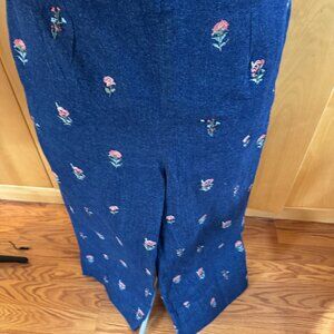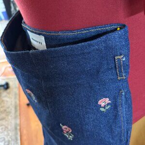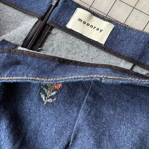 Fantastic high waist denim pants with sweet floral cross-stitch. Part of the spring Moonray collection. Back zip.