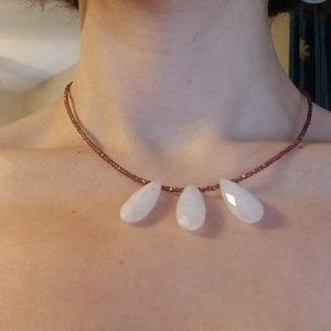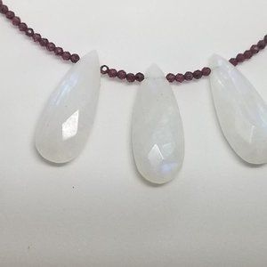 This is a handmade (by me) necklace using VERY tiny natural faceted rubies featuring three 10x25mm moonstone (they have some blue flash but are mostly white) teardrop pendants. This piece is striking and versatile!