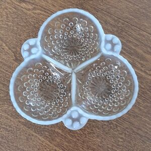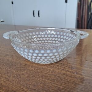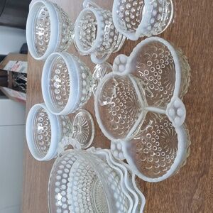 Vintage Anchor Hocking ten piece set. The pattern, called "Moonstone Opalescent," was made by Anchor Hocking and discontinued around 1946. These dishes feature a hobnail texture design with white opalescent trim. The set includes a sugar and creamer, a divided relish bowl, serving bowl, three dessert bowls, and three sorbet bowls.