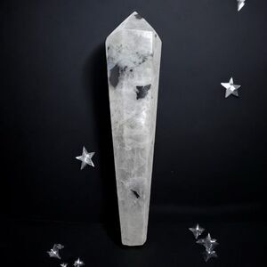 A Moonstone crystal meditation wand, shimmering with iridescent hues, is a tool of inner peace and intuition. Known for enhancing emotional balance, it supports new beginnings, calms stress, and strengthens intuition. Its gentle energy soothes and aligns the chakras, promoting clarity and spiritual growth.