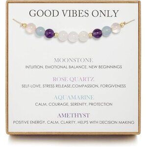 MATERIALS: The bracelet is made of high quality rmoonstone, rose quartz, aquamarine and amethyst. The calming energy of Moonstone combined with the power of positive affirmations can help shield you from negativity and attract only good vibes into your life. This bracelet will not turn your skin green, red or itchy. You can wear this bracelet comfortably on any occasion, as they are lightweight and safe and do not depress or irritate sensitive skin.