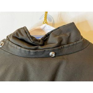 This is in excellent used condition. It was just dry cleaned as well as the hood. Both show now wear. Color is a dark khaki./green tan. MSRP new is $1199.99