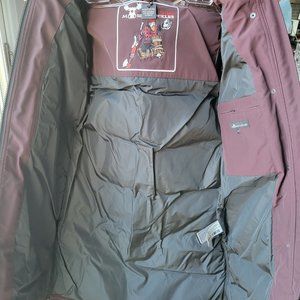 Never worn!!!!! Burgundy sleek warm durable breathable versatile functional Blue Fox fur zip up, black accented heavyweight hooded down parka. Two-way front black metal zip closure. Six front concealed snap button storm flap closure. Wind flap under front zipper. Gold quilted 'Moose Knuckles' woven jacquard logo print lining. Removable two-way adjustable hood with two snap button collar closure. Blue Fox fur hood trim. Stand up collar. Elongated back. Reinforced open back shoulder panels. Inner ribbed storm cuffs. Reinforced shoulder patches and front hem. Four front fleece lined seam pockets. Two interior zip pockets. Brushed metal rivets. Brush metal plated 'Moose Knuckles' metal patch logo on left sleeve. Tonal stitching. Slim fit. Mid-thigh length.