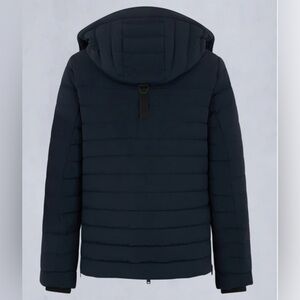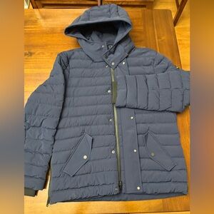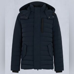 Experience warmth with this stylish navy puffer. Features a sleek design and hood.
