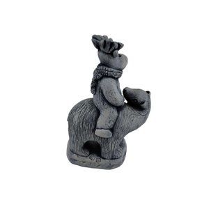 This charming figurine depicts a whimsical moose wearing a scarf, seated atop a polar bear. Crafted with detailed textures and a playful design, it brings a touch of Arctic inspiration to decor. A collectible piece from Alaska Originals, evoking a sense of wonder and storytelling with its unique sculpting artistry.