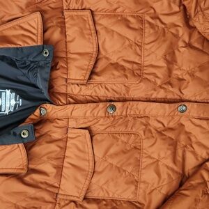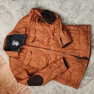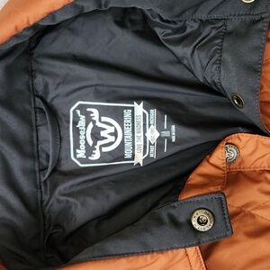 Stylish Moosejaw puffer jacket. Quilted design with button closure. Features chest pockets and elbow patches.
