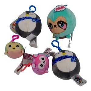 Moosh Moosh Mini Clipz (2), Squishmallows Penguin Clip Ons (2), and Squeezamals