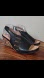 Black faux leather wedge sandals. Cork wedge with flower embroidery stitched design. Slip on design with elastic at heels. Perfect for any occasion, they offer both comfort and sophistication.