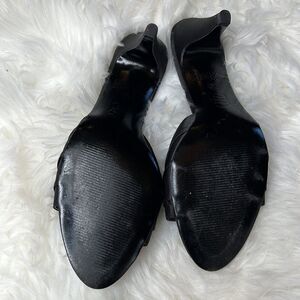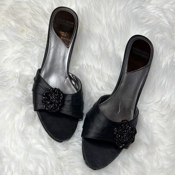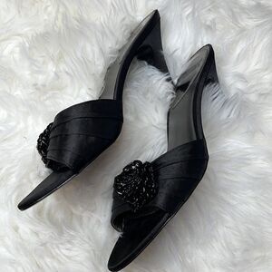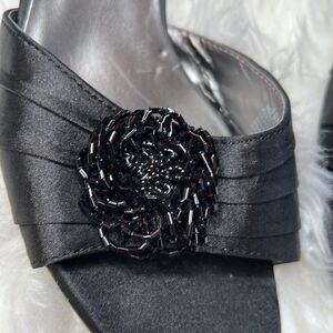 Open back open toe 3.5 inch heel satin beaded flower very classic pinup style. Smoke free dog friendly home.