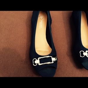 Navy Blue, worn once. Like new. Comfortable. Narrow.
