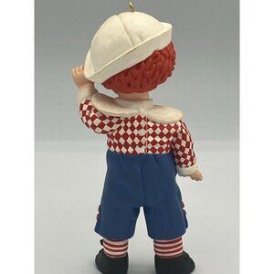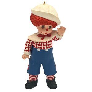 This charming ornament from Hallmark’s beloved Madame Alexander® series features Mop Top Billy, styled as a classic boy doll in bright blue overalls, a red checkered shirt, and white sailor hat.