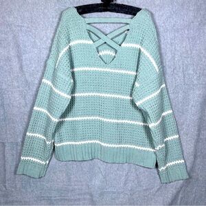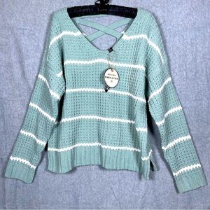 Moral Fiber NWT Chenille V-neck Chunky Knit Cross Back Green Striped Sweater