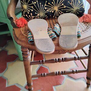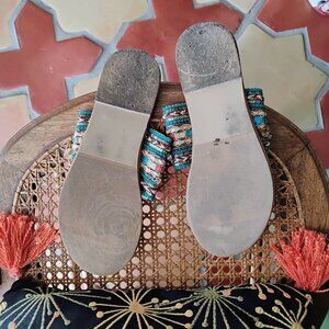 Sparkly, glittery boho toe-ring style sandals in size 9.5 M. Bought gently used on Poshmark a few years ago but only wore once or twice. Still in very good used condition! They would also be great for a costume or theater production as well as adding some glitz to a simple summer outfit.