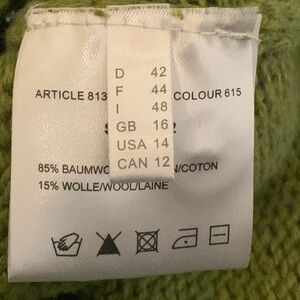 This vibrant green cardigan offers a relaxed fit, perfect for layering. Crafted from a soft knit wool blend fabric, it provides warmth and comfort for any occasion. The waist-length design and long sleeves make it a versatile addition to your wardrobe. No flaws. Size US 14. Armpit to Armpit 23 inches. Shoulder to Hem 19 inches.
