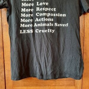 More Plants Less Cruelty black graphic short sleeve t-shirt. Round ribbed neckline with short sleeves, large front positive message graphic, and a straight hemline. Cracked graphics and small between graphic and hemline, shown in pictures. Otherwise, it's in good condition! Lightweight material 100% cotton. Unisex. Size medium.