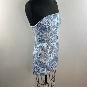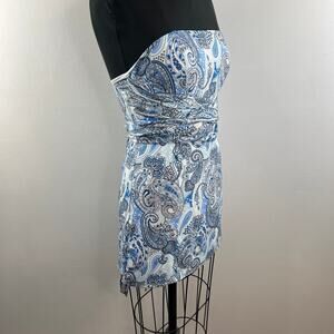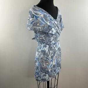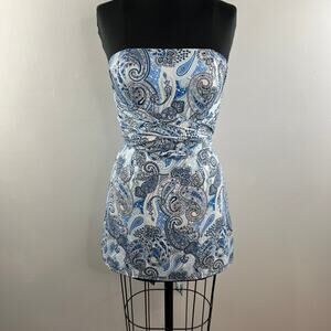 More To Come Blue White Crossover Mini Dress Paisley Waist Tie Back Zip Size XS