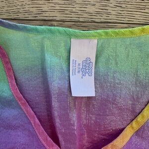 Vibrant rainbow tie-dye cover-up. Features pom pom trim on the sides. Perfect for beach days.