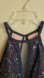 Morgan & Co coquette, attractive, flirty, sexy, fairy, whimsgoth, gothic, illusion fit & flare halter dress, gray with sparkly sequins, floral lace, see thru fabric at waist, back cut out, fully lined, attached crinoline, breast pads for better fit, side zipper closure, back neck button, nylon & polyester spandex blend.