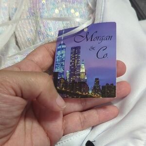 Elegant white gown with shimmering sequins. Features a deep V-neck and high slit. Perfect for formal occasions.