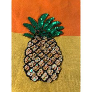 Morgan Cole shirt sweater. Colorblock. Orange. Yellow. Purple. Sequin pineapple on the front. Short sleeves. Size M. Measures approx. 18" armpit to armpit and 23" shoulder to hem. Great preowned condition.