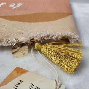 NWT Morgan Harper Nichols Fringe Be Still Cream Canvas Pouch Bag Clutch. Designed by a creative artist, musician & writer. Heavy weight 100% cream speckled canvas, fringe edges, white embroidered design, colors of peach, tan & mustard yellow, top zip closure, gold Fringe charm, mustard yellow tassel, approximately 8.25" x 5.25". Brand new with tags! 2 available! Bundle & save with the other matching Fringe items in my closet!