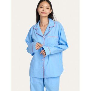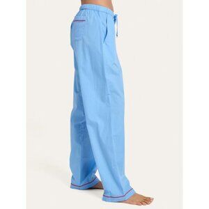 Morgan Lane "Tommy" pajama set in cornflower blue with red trim. Made with 100% pure cotton for a soft, crisp feel. The Tommy PJ is a unisex style and sizing is based on men's styling, so women should go down one size. This pair are a size small, which Morgan Lane compare to a US 4, and run large. Please see the Morgan Lane size chart for their comparisons.