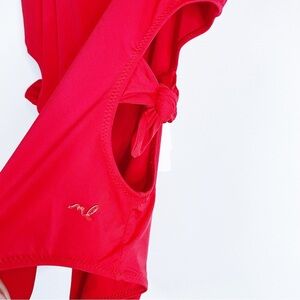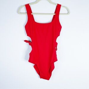 Morgan Lane red one piece swimsuit. Tie and cutout detail at sides.