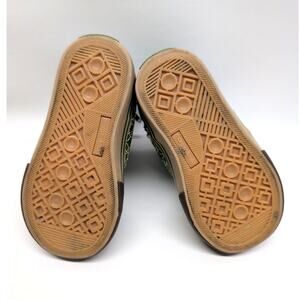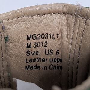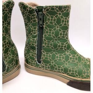 These are adorable, lightly worn, green boots with leather uppers and cream colored stitching. Size 6 girls, fits true to size.