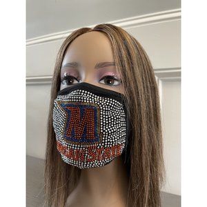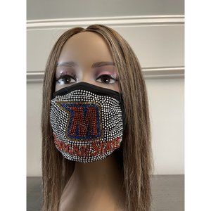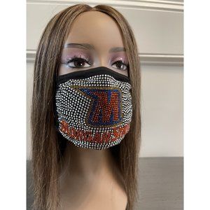 Covered in rhinestones, this design features gorgeous, blue, gold, orange and clear rhinestones on a black comfortable, washable and reusable mask.