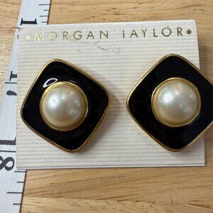 Morgan Taylor Gold-Tone Black Enamel & Faux Pearl Square Pierced Earrings Made I