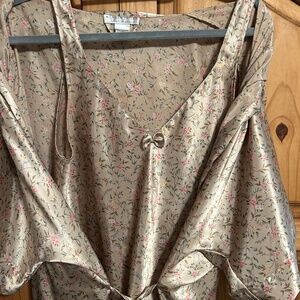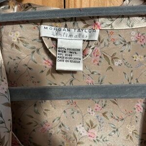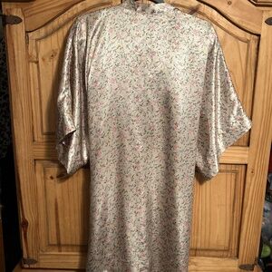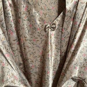 Floral design is so feminine and pretty. Size M/L. Tan with pink roses and colorful leaves. Slip has little bow on front. Robe is 3/4 lengths sleeves. 100% Polyester. Robe is 37 inches long and slip is 34 inches long. Slip is pit to pit 23 inches.